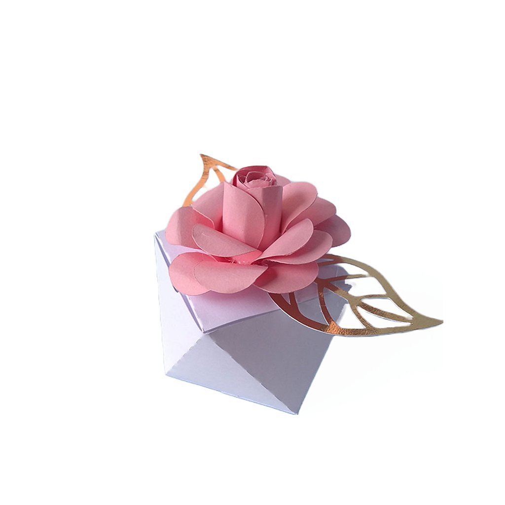Decoração: A caixa é finalizada com uma flor de papel em 3D e folhas, que podem ser personalizadas nas cores do evento.